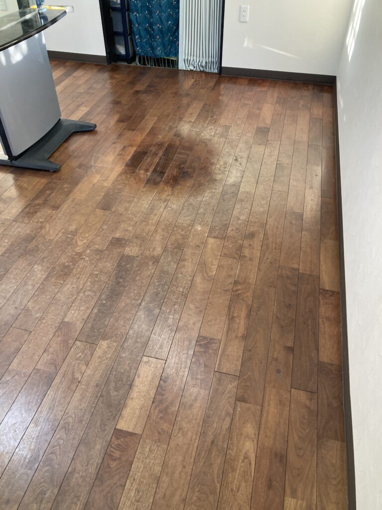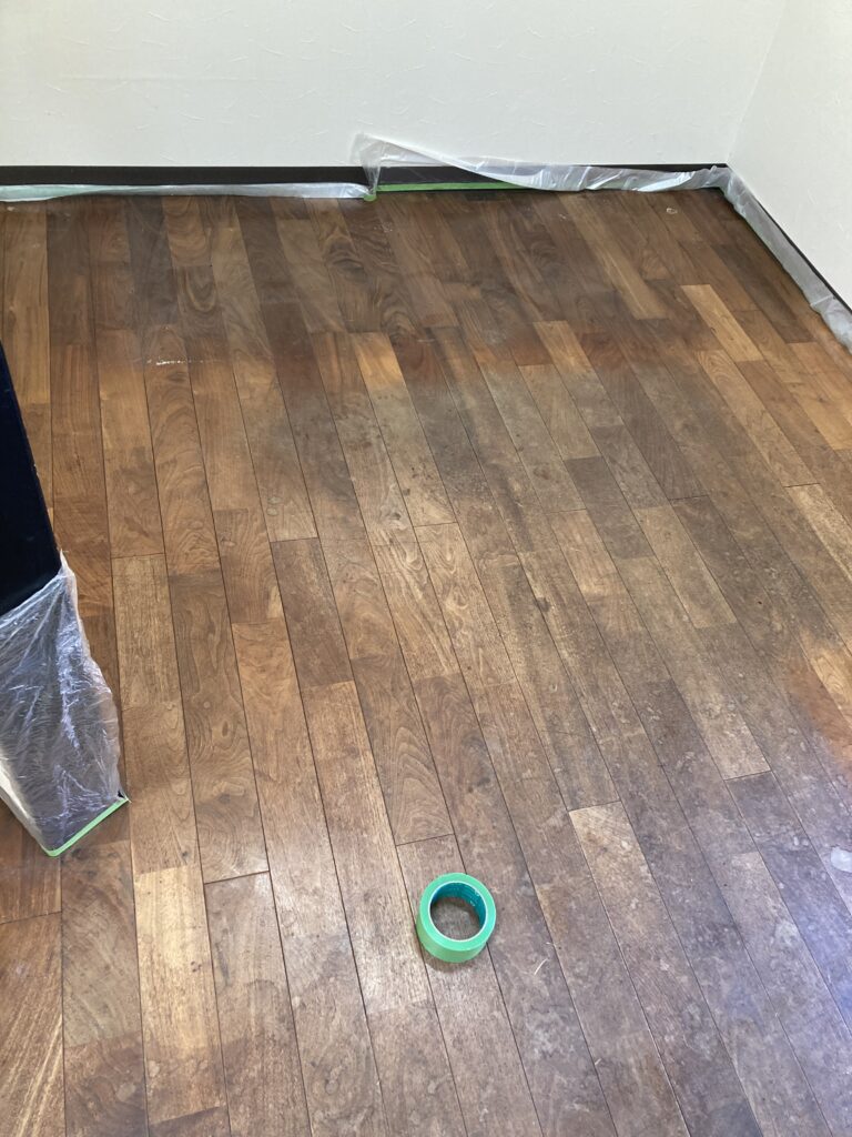 全体的に汚れや水染みが多く、コーティングも剥がれているところが目立ちます。汚れの強い無垢フローリングに対しては「再生研磨」での再塗装が一般的かと思いますが、あくまで美装での対応がご希望とのことでしたので、お客様とのご相談の上、今回は木部灰汁洗いで汚れを落とし「蜜蝋ワックス」で仕上げていくことにします。