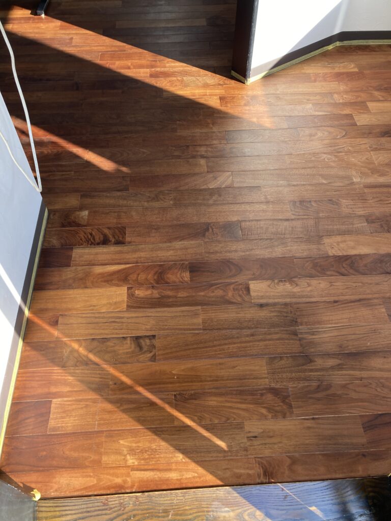 汚れを取り漂白したことで均一に塗料が乗り、ツヤのあるフローリングに生まれ変わりました。お客様も「お店を開いた当時に戻ったようで嬉しい」と大変喜んでくださりました。